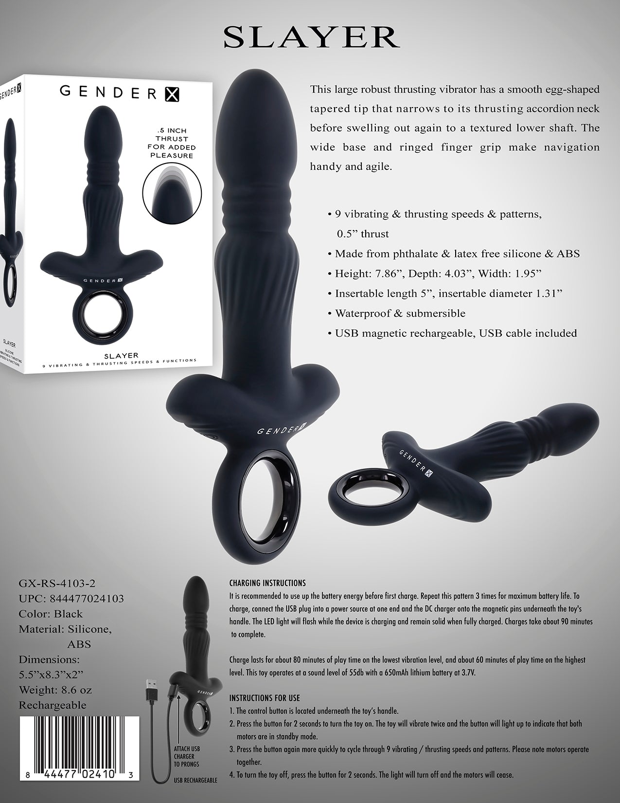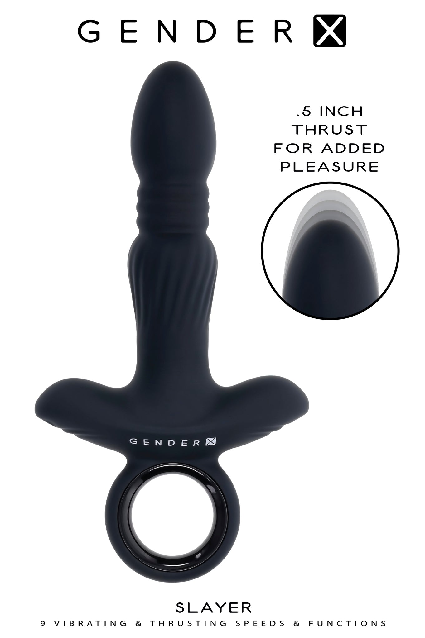 Gender X Slayer không chỉ rung mà còn đâm nhịp nhàng, kết hợp trục dưới có vân nổi để tăng thêm cảm giác tê dại thú vị. Tay cầm rộng với vòng ngón tay tiện lợi giúp bạn kiểm soát dễ dàng, an toàn và chính xác. Sản phẩm lý tưởng cho kích thích tuyến tiền liệt, khám phá hậu môn sâu hay massage toàn thân.