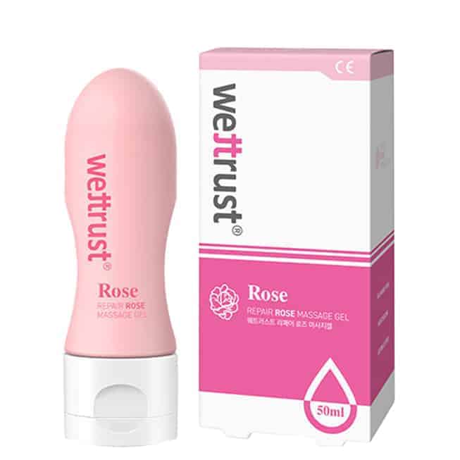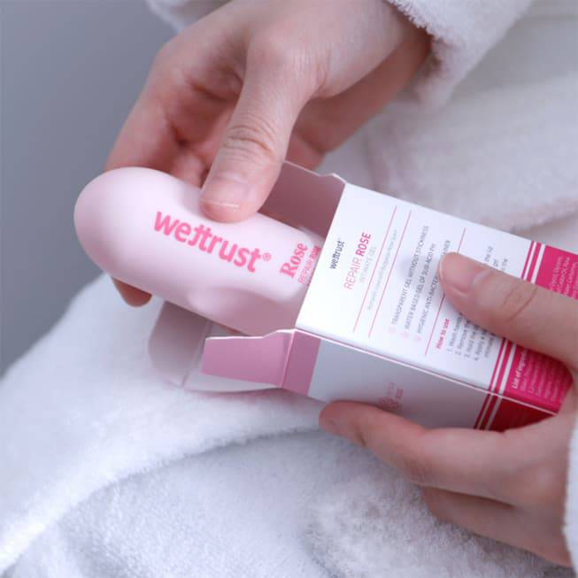 Lube Wettrust Repair Rose trên nền nước, dung tích 50ml, mang hương hoa hồng Bulgaria quyến rũ. Thành phần tự nhiên như chiết xuất hoa hồng Damascus, trà xanh, St. John's Wort giúp dưỡng ẩm, làm lành vùng kín hiệu quả.