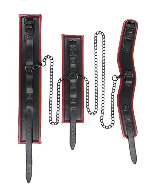 Nội dung hộp: 1 vòng cổ, 1 còng đôi cổ tay, 1 còng đôi mắt cá, 1 dây xích đen dài kết nối. 📦